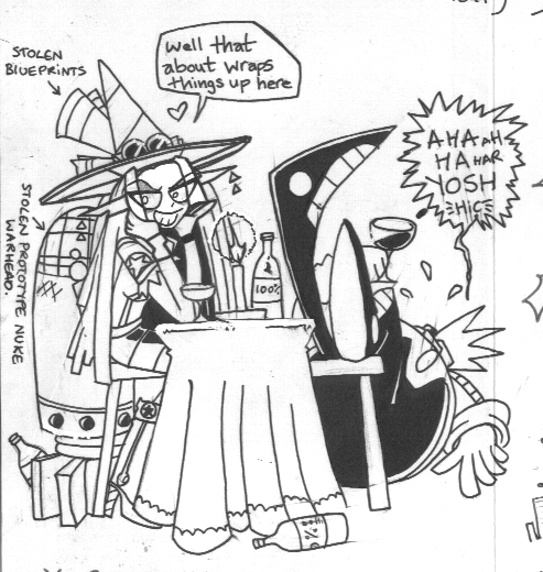 iNDiGO and Dr. Robotnik enjoy a friendly drink between megalomanical supervillains. This was doodled in a christmas card sent to me by Lynne Triplett!